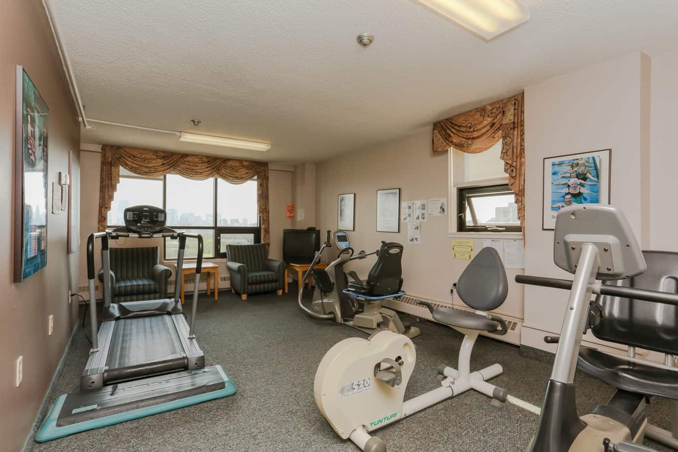 Kiwanis Place Lodge contains 205 single and double rooms, all with balconies. The top floor is home to a penthouse with a small kitchen area and a spectacular view of downtown Edmonton, and residents can book this common area for small parties and gatherings. With a full recreation calendar, residents stay active and engaged with a variety of special events, bus outings, and daily activities. The auditorium on the ground floor is the place to come together for activities like shuffleboard, bingo, sing-a-longs, ice cream parlours, movie night, happy hour and pub night, and live entertainment. The ground floor also has a large lounge where residents can sit with friends to play cards, read the newspaper, engage in mental aerobics with crossword puzzles, or use one of the computers to keep in touch with family and friends. Residents can also take advantage of the on-site hair salon, exercise room with treadmill and recumbent bike. Some of the many services available at the lodge include an ATM, health clinics, foot doctor, hearing clinics, library drop-off, and monthly visits from students at nearby Oliver School and the Pet Therapy Society of Northern Alberta.